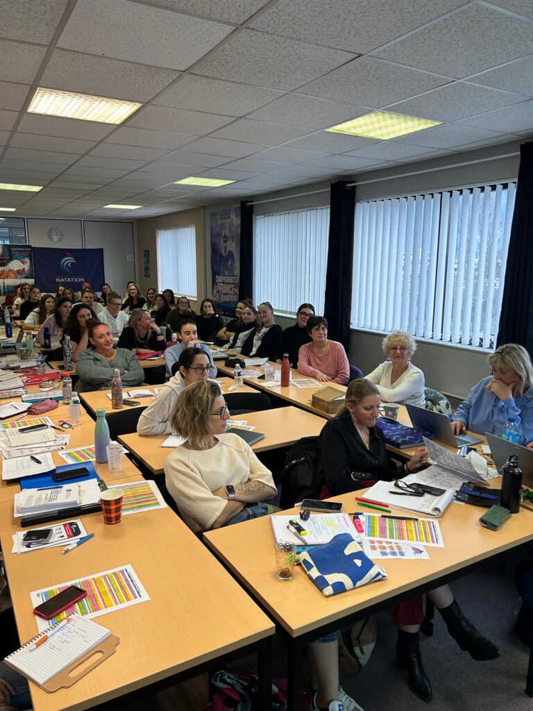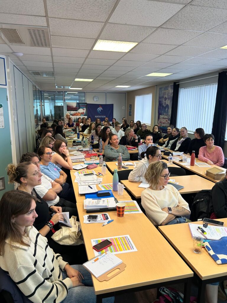 Jade Cadiere, responsable technique NA de la ligue AuRA, présente les évolutions du règlement dans une ambiance studieuse lors du séminaire des entraîneures et des juges de Natation Artistique du dimanche 16 novembre dans les locaux de la Ligue.